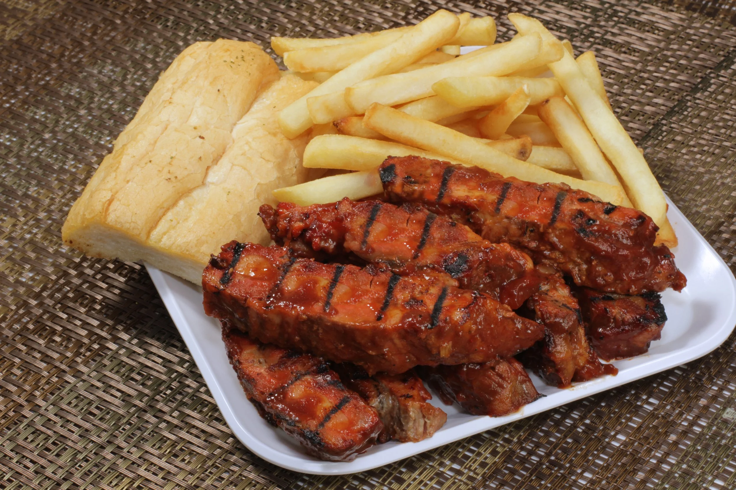 steak or chicken, beans, lettuce, sour cream, cheese, tomato