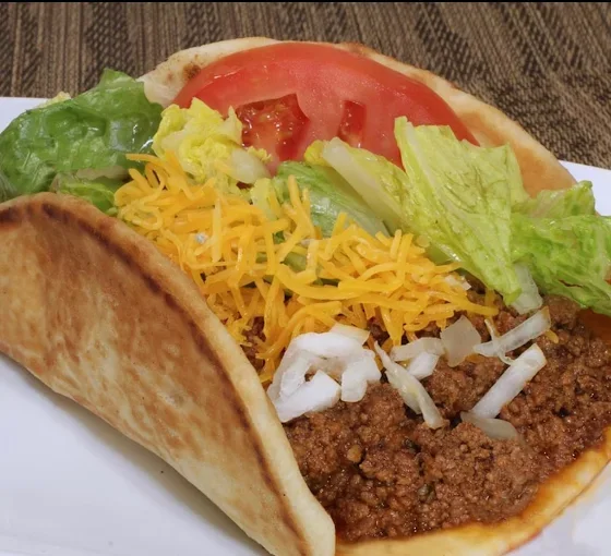 pita, lettuce, tomato, onion, cheese, hot sauce
