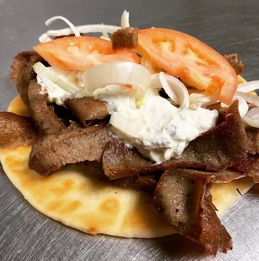 pita, onions, tomatoes, tzatziki, fries, greek salad